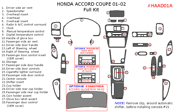 Honda Accord 2001-2002, Coupe, Full Interior Kit, 28 Pcs.