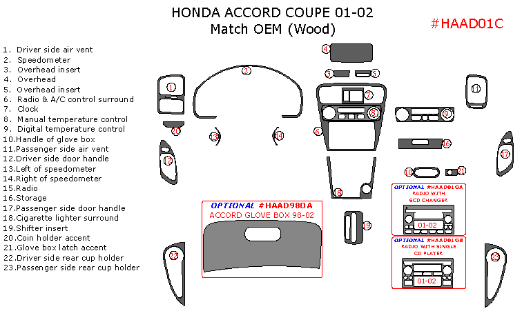 We offer a wide variety of colors and materials of Honda Accord 2001-2002, Interior Dash Kit, Coupe, 23 Pcs., Match OEM (Wood). Choose your favourite option and place an order.