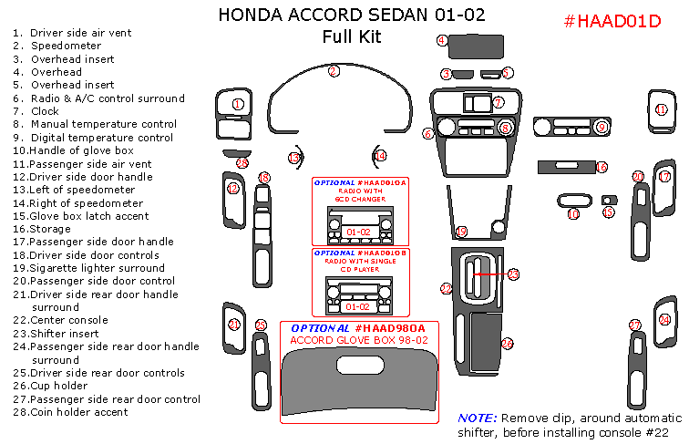 Honda Accord 2001-2002, Sedan, Full Interior Kit, 28 Pcs.
