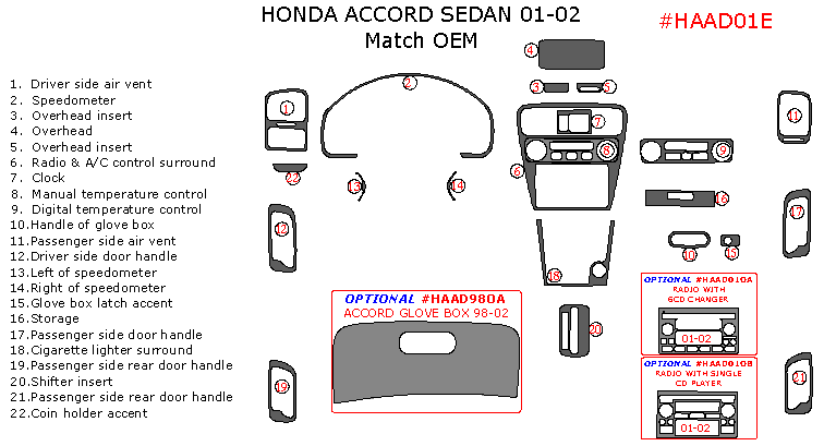 We offer a wide variety of colors and materials of Honda Accord 2001-2002, Interior Dash Kit, Sedan, 22 Pcs., Match OEM. Choose your favourite option and place an order.