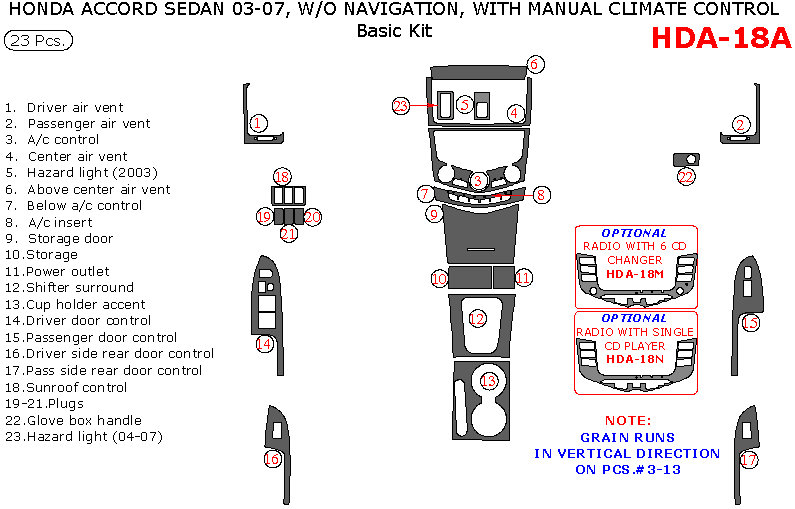 Honda Accord 2003, 2004, 2005, 2006, 2007, Basic Interior Kit, Without Navigation, With Manual Climate Control, 23 Pcs.