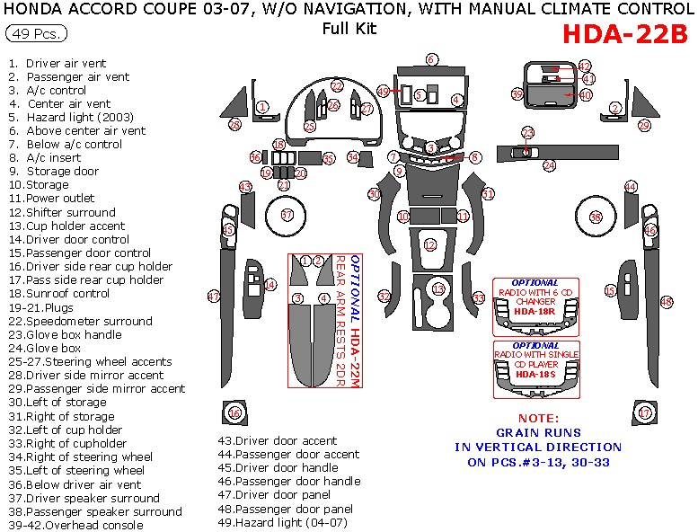 Honda Accord 2003, 2004, 2005, 2006, 2007, Coupe, Full Interior Kit, 49 Pcs., Without Navigation, With Manual Climate Control