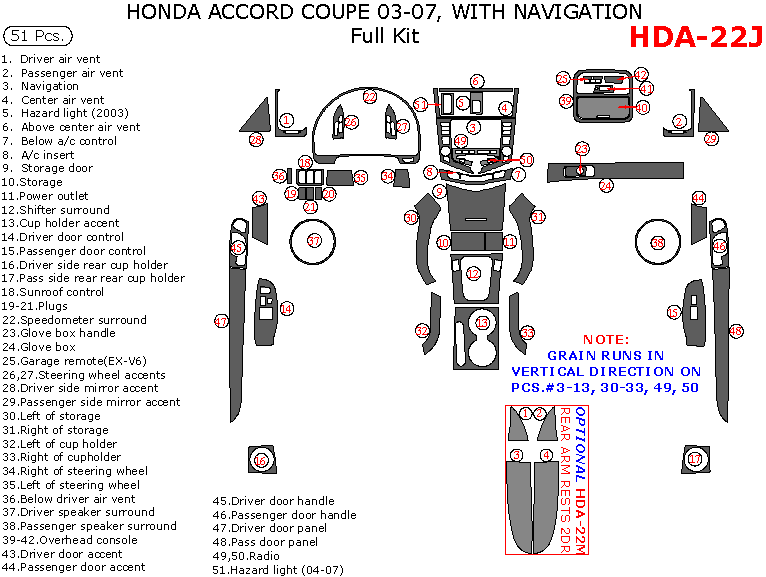 We offer a wide variety of colors and materials of Honda Accord 2003, 2004, 2005, 2006, 2007, Coupe, Full Interior Kit, With Navigation, 51 Pcs. Choose your favourite option and place an order.