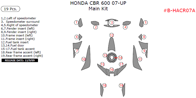 Honda CBR 600 2007, 2008, 2009, 2010, 2011, 2012, 2013, 2014, 2015, Main Kit, 19 Pcs.