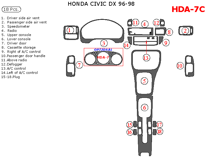 We offer a wide variety of colors and materials of Honda Civic 1996, 1997, 1998, Interior Kit, DX Only, 18 Pcs. Choose your favourite option and place an order.