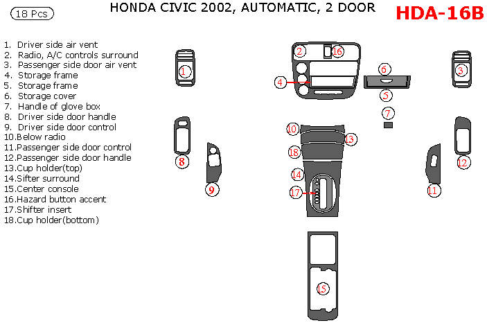 Honda Civic 2002, Interior Dash Kit, Automatic, 2 Door, 18 Pcs.