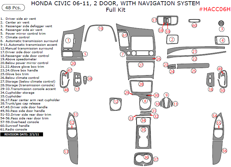 Honda Civic 2006, 2007, 2008, 2009, 2010, 2011, 2 Door, With Navigation System, Full Interior Kit, 48 Pcs.
