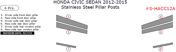 Honda Civic Sedan 2012, 2013, 2014, 2015, Stainless Steel Pillar Posts, 6 Pcs.