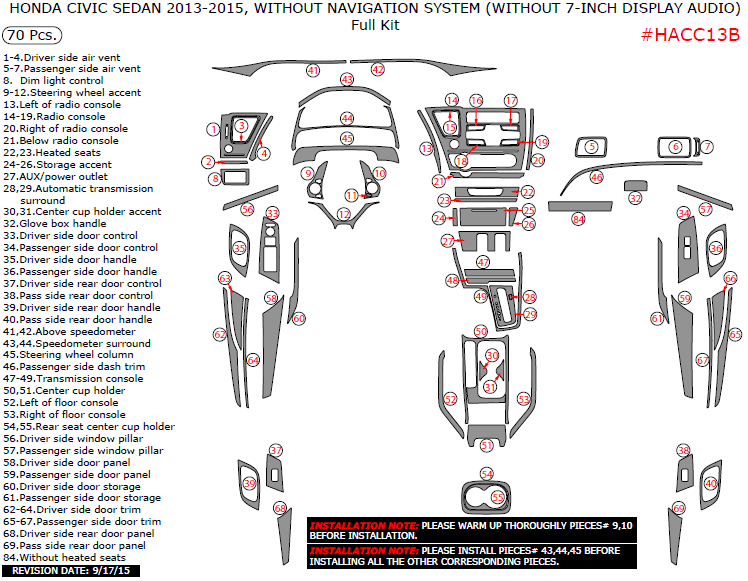 Honda Civic 2013, 2014, 2015, Without Navigation System (Without 7-Inch Display Audio), Full Interior Kit (Sedan Only), 70 Pcs.