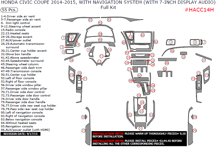Honda Civic 2014-2015, With Navigation System (With 7-Inch Display Audio), Full Interior Kit (Coupe Only), 55 Pcs.