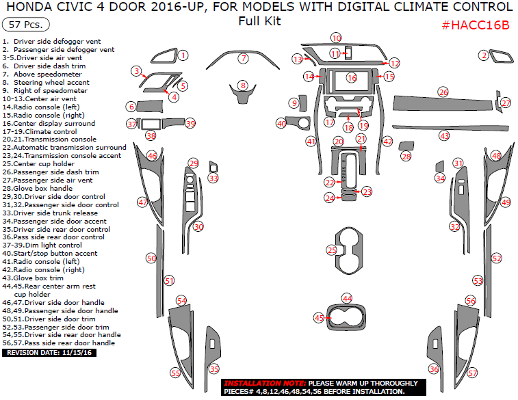 Honda Civic 4 Door 2016, 2017, For Models With Digital Climate Control, Full Interior Kit, 57 Pcs.