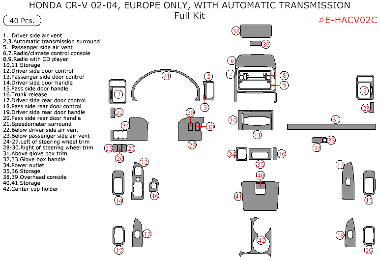 Honda CR-V 2002, 2003, 2004, With Automatic Transmission, Basic Interior Kit, 40 Pcs. Europe Only