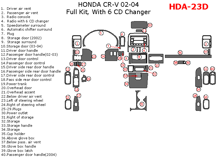 Honda CR-V 2002, 2003, 2004, Full Interior Kit, With 6 CD Changer, 39 Pcs.