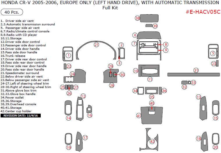 Honda CR-V 2005-2006, With Automatic Transmission, Basic Interior Kit (Europe Only), 40 Pcs.