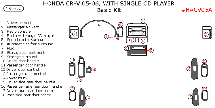 Honda CR-V 2005-2006, Basic Interior Kit, With Single CD Player, 18 Pcs.