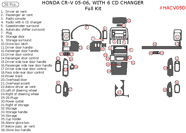 Honda CR-V 2005-2006, Full Interior Kit, With 6 CD Changer, 38 Pcs.