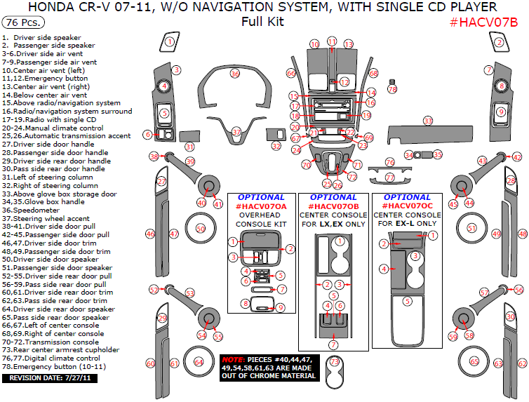 Honda CR-V 2007, 2008, 2009, 2010, 2011, Without Navigation System, With Single CD Player, Full Interior Kit, 76 Pcs.