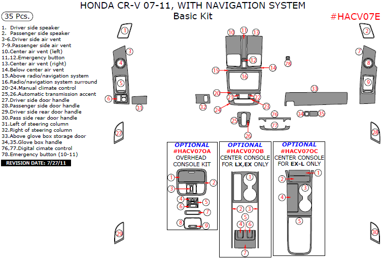 Honda CR-V 2007, 2008, 2009, 2010, 2011, With Navigation System, Basic Interior Kit, 35 Pcs.
