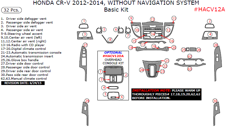 Honda CR-V 2012, 2013, 2014, Without Navigation System, Basic Interior Kit, 32 Pcs.