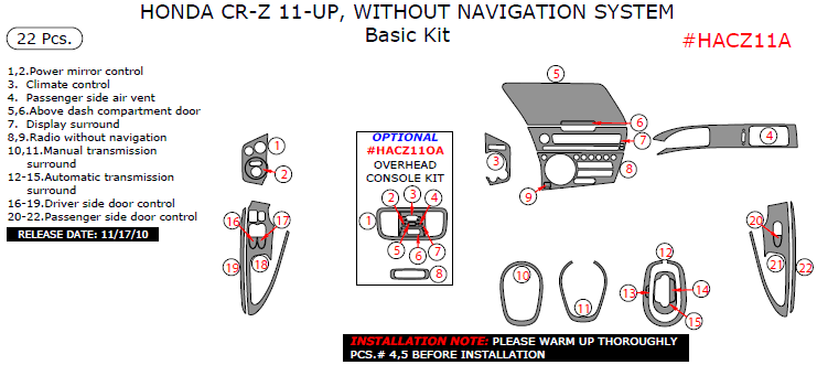 We offer a wide variety of colors and materials of Honda CR-Z 2011, 2012, 2013, 2014, 2015, Without Navigation System, Basic Interior Kit, 22 Pcs. Choose your favourite option and place an order.