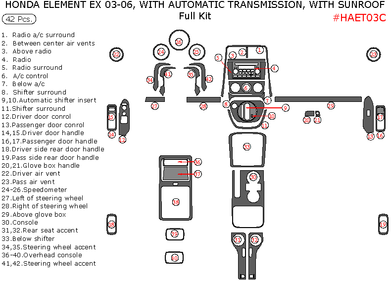 Honda Element 2003, 2004, 2005, 2006, EX, With Automatic Transmission, With Overhead, Full Interior Kit, 42 Pcs.