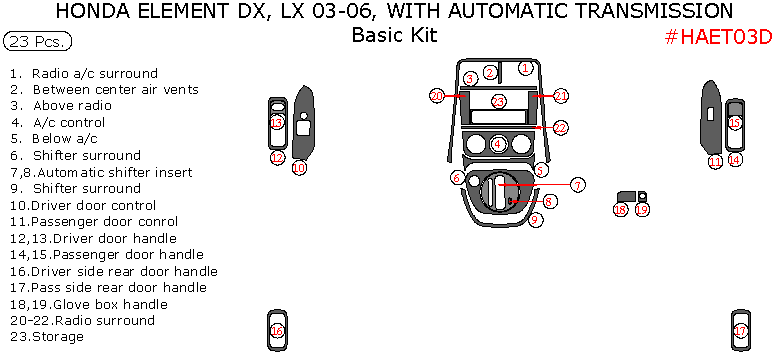 Honda Element 2003, 2004, 2005, 2006, DX LX, With Automatic Transmission, Basic Interior Kit, 23 Pcs.