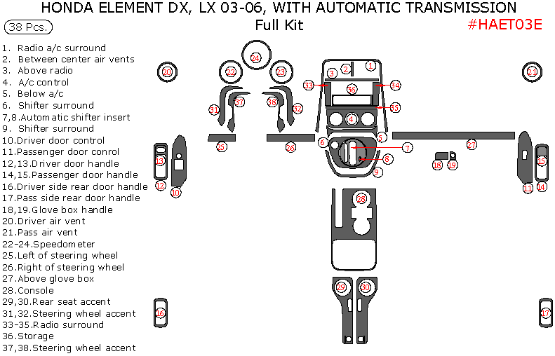 Honda Element 2003, 2004, 2005, 2006, DX LX, With Automatic Transmission, Full Interior Kit, 38 Pcs.