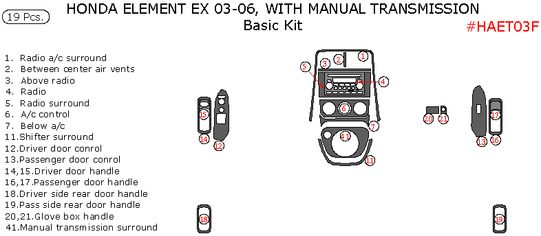 Honda Element 2003, 2004, 2005, 2006, EX, With Manual Transmission, Basic Interior Kit, 19 Pcs.