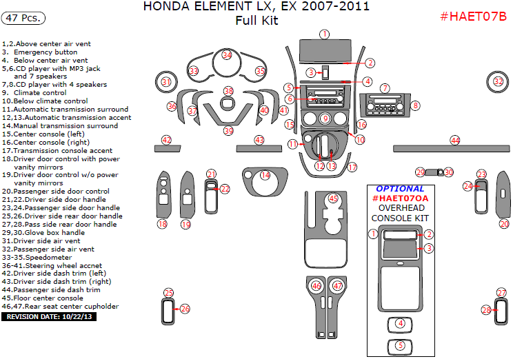 We offer a wide variety of colors and materials of Honda Element 2007, 2008, 2009, 2010, 2011, LX/DX, Full Interior Kit, 47 Pcs. Choose your favourite option and place an order.