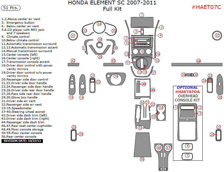 We offer a wide variety of colors and materials of Honda Element 2007, 2008, 2009, 2010, 2011, SC, Full Interior Kit, 51 Pcs. Choose your favourite option and place an order.