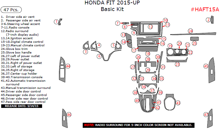 Honda Fit 2015, 2016, 2017, 2018, 2019, 2020 Basic Interior Kit, 47 Pcs.