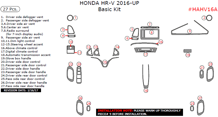 Honda HR-V 2016, 2017, 2018, 2019, 2020, 2021, 2022 Basic Interior Kit, 27 Pcs.
