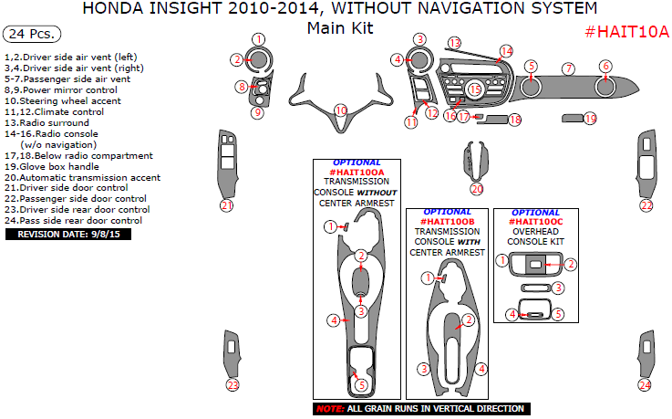 Honda Insight 2010, 2011, 2012, 2013, 2014, Without Navigation System, Main Interior Kit, 24 Pcs.