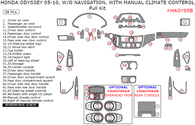 We offer a wide variety of colors and materials of Honda Odyssey 2005, 2006, 2007, 2008, 2009, 2010, W/o Navigation, With Manual Climate Control, Full Interior Kit, 38 Pcs. Choose your favourite option and place an order.