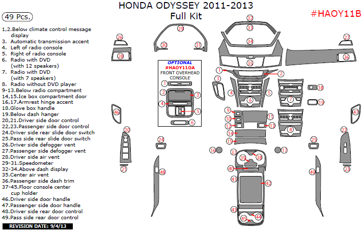 We offer a wide variety of colors and materials of Honda Odyssey 2011, 2012, 2013, Full Interior Kit, 49 Pcs. Choose your favourite option and place an order.