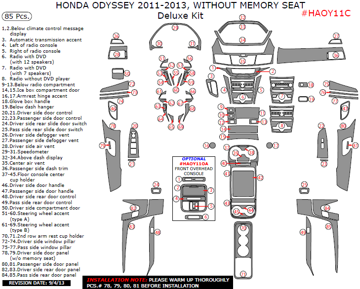 Honda Odyssey 2011, 2012, 2013, With Memory Seat, Deluxe Interior Kit, 85 Pcs.