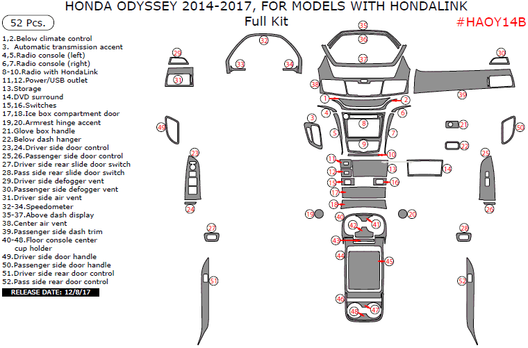 Honda Odyssey 2014-2017, For Models With HondaLink, Full Kit, 52 Pcs. Please Select Color RBA - Real Brushed Aluminum / add 15% RBBCF - Real Blue & Black Carbon Fiber / add 30% RC - Real Chrome RCF - Real Carbon Fiber / add 30% RDBCF - Real Dark Blue Carbon Fiber / add 30% RDMW - Real Dark Mahogany Wood (Non Stock Color) / add 30% RJCW - Real Japanese Cherry Wood / add 30% RMBW - Real Medium Burl Wood (Non Stock Color) / add 30% ROCF - Real Orange Carbon Fiber / add 30% RPW - Real Platinum Wood / add 30% RRBCF - Real Red & Black Carbon Fiber / add 30% RRCF - Real Red Carbon Fiber / add 30% RRW - Real Rosewood / add 30% RSWCF - Real Silver Wire Carbon Fiber / add 30% RWBW - Real Walnut Burl Wood (Non Stock Color) / add 30% RYBCF - Real Yellow & Black Carbon Fiber / add 30% RYCF - Real Yellow Carbon Fiber / add 30% SA - Aluminum (Non Stock Color) SAZW - African Zebra Wood SBA - Brushed Aluminum SBEW - Birdseye Wood (Non Stock Color) SBLACK - Black (Non Stock Color) SBLUE - Blue (Non Stock Color) SCF - Carbon Fiber SDBW - Dark Burl Wood SDESERT - Desert Camo (Non Stock Color) SDMW - Dark Mahogany Wood (Non Stock Color) SDZW - Dark Zebra Wood (Non Stock Color) SEZW - Ebony Zebra Wood (Non Stock Color) SFOREST - Forest Camo (Non Stock Color) SHBW - Honey Burl Wood SJCW - Japanese Cherry Wood (Non Stock Color) SMBW - Medium Burl Wood SNBW - Newport Burl Wood SORANGE - Orange (Non Stock Color) SPINK - Pink (Non Stock Color) SPW - Platinum Burl Wood SRED - Red (Non Stock Color) STBW - Titanium Burl Wood SWBW - Walnut Burl Wood (Non Stock Color) SWHITE - White (Non Stock Color) SYELLOW - Yellow (Non Stock Color) Item #:HAOY14B Random Image. Example only. See diagram $402.90 - $523.77 Price as configured: $402.90 MANUFACTURING TIME 5-7 BUSINESS DAYS FREE SHIPPING TO CONTINENTAL USA Add to Cart Add to Wishlist Price as configured: $463.34 Item #: HAOY14B Add to Cart Random Image. Example only. See diagram RBA - Real Brushed Aluminum RBBCF - Real Blue & Black Carbon Fiber RC - Real Chrome RCF - Real Carbon Fiber RDBCF - Real Dark Blue Carbon Fiber RDMW - Real Dark Mahogany Wood (Non Stock Color) RJCW - Real Japanese Cherry Wood RMBW - Real Medium Burl Wood (Non Stock Color) ROCF - Real Orange Carbon Fiber RPW - Real Platinum Wood RRBCF - Real Red & Black Carbon Fiber RRCF - Real Red Carbon Fiber RRW - Real Rosewood RSWCF - Real Silver Wire Carbon Fiber RWBW - Real Walnut Burl Wood (Non Stock Color) RYBCF - Real Yellow & Black Carbon Fiber RYCF - Real Yellow Carbon Fiber SA - Aluminum (Non Stock Color) SAZW - African Zebra Wood SBA - Brushed Aluminum SBEW - Birdseye Wood (Non Stock Color) SBLACK - Black (Non Stock Color) SBLUE - Blue (Non Stock Color) SCF - Carbon Fiber SDBW - Dark Burl Wood SDESERT - Desert Camo (Non Stock Color) SDMW - Dark Mahogany Wood (Non Stock Color) SDZW - Dark Zebra Wood (Non Stock Color) SEZW - Ebony Zebra Wood (Non Stock Color) SFOREST - Forest Camo (Non Stock Color) SHBW - Honey Burl Wood SJCW - Japanese Cherry Wood (Non Stock Color) SMBW - Medium Burl Wood SNBW - Newport Burl Wood SORANGE - Orange (Non Stock Color) SPINK - Pink (Non Stock Color) SPW - Platinum Burl Wood SRED - Red (Non Stock Color) STBW - Titanium Burl Wood SWBW - Walnut Burl Wood (Non Stock Color) SWHITE - White (Non Stock Color) SYELLOW - Yellow (Non Stock Color) Description Additional information Reviews (0) CUSTOMER REVIEWS 0 ITEM(S) Add Your Review Let us know your thoughts * Summary of Your Review* What's your nickname?* Submit Review Description Additional information Reviews (0) CUSTOMER REVIEWS 0 ITEM(S) Add Your Review Let us know your thoughts * Summary of Your Review* What's your nickname?* Submit Review California Residents Warning Cancer and Reproductive Harm. www.p65warnings.ca.gov Other products $190.36 HACV12A Honda CR-V 2012, 2013, 2014, Without Navigation System, Basic Interior Kit, 32 Pcs. more $16.80 HAPT03OB Honda Pilot 2003, 2004, 2005, 2006, 2007, 2008, Optional Overhead Console Interior Kit, 2 pcs. more $22.40 HAAD01OA Honda Accord 2001-2002, Interior Dash Kit, Optional Radio With 6 CD Changer, 1 ps. Match OEM more $22.40 HAAD01OB Honda Accord 2001-2002, Interior Dash Kit, Optional Radio With Single CD Player, 1 ps. Match OEM more $22.40 HDA-18M Honda Accord 2003, 2004, 2005, 2006, 2007, Interior Dash Kit, Optional Radio With 6 CD Changer, 1 Pcs. more $22.40 HDA-18N Honda Accord 2003, 2004, 2005, 2006, 2007, Interior Dash Kit, Optional Radio With Single CD Player, 1 Pcs. more RECENTLY VIEWED PRODUCTS Ford F-150 2002-2003, Harley Davidson Edition, Full Interior Kit, Without Sunroof, 37 Pcs. Jeep Compass/Patriot 2007, 2008, 2009, 2010, 2011, 2012, 2013, 2014, 2015, 2016, 2017, Optional Door Interior Trim Kit, 10 Pcs. RBA - Real Brushed Aluminum RBBCF - Real Blue & Black Carbon Fiber RC - Real Chrome RCF - Real Carbon Fiber RDBCF - Real Dark Blue Carbon Fiber RDMW - Real Dark Mahogany Wood (Non Stock Color) RJCW - Real Japanese Cherry Wood RMBW - Real Medium Burl Wood (Non Stock Color) ROCF - Real Orange Carbon Fiber RPW - Real Platinum Wood RRBCF - Real Red & Black Carbon Fiber RRCF - Real Red Carbon Fiber RRW - Real Rosewood RSWCF - Real Silver Wire Carbon Fiber RWBW - Real Walnut Burl Wood (Non Stock Color) RYBCF - Real Yellow & Black Carbon Fiber RYCF - Real Yellow Carbon Fiber SA - Aluminum (Non Stock Color) SAZW - African Zebra Wood SBA - Brushed Aluminum SBEW - Birdseye Wood (Non Stock Color) SBLACK - Black (Non Stock Color) SBLUE - Blue (Non Stock Color) SCF - Carbon Fiber SDBW - Dark Burl Wood SDESERT - Desert Camo (Non Stock Color) SDMW - Dark Mahogany Wood (Non Stock Color) SDZW - Dark Zebra Wood (Non Stock Color) SEZW - Ebony Zebra Wood (Non Stock Color) SFOREST - Forest Camo (Non Stock Color) SHBW - Honey Burl Wood SJCW - Japanese Cherry Wood (Non Stock Color) SMBW - Medium Burl Wood SNBW - Newport Burl Wood SORANGE - Orange (Non Stock Color) SPINK - Pink (Non Stock Color) SPW - Platinum Burl Wood SRED - Red (Non Stock Color) STBW - Titanium Burl Wood SWBW - Walnut Burl