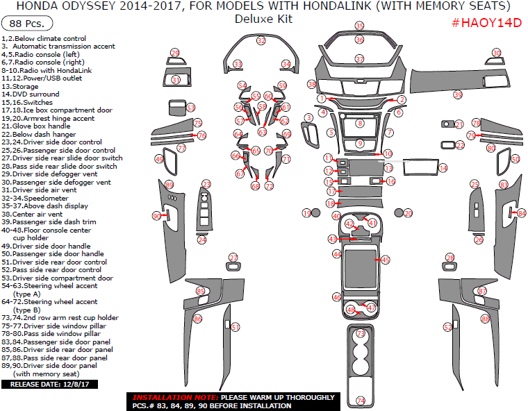 Honda Odyssey 2014-2017, For Models With HondaLink (With Memory Seats), Deluxe Kit, 88 Pcs.