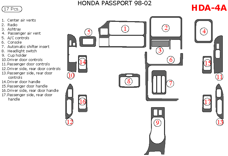 We offer a wide variety of colors and materials of Honda Passport 1998, 1999, 2000, 2001, 2002, Full Interior Kit, 17 Pcs. Choose your favourite option and place an order.