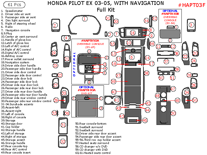 Honda Pilot EX 2003, 2004, 2005, Full Interior Kit, With Navigation System, 61 Pcs.