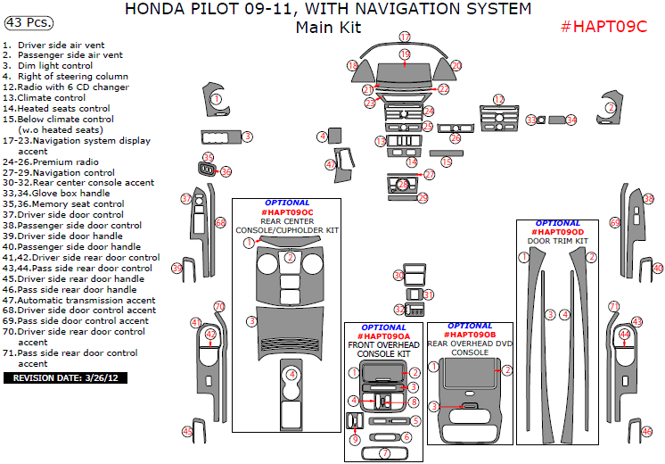 Honda Pilot 2009, 2010, 2011, With Navigation System, Main Interior Kit, 43 Pcs.