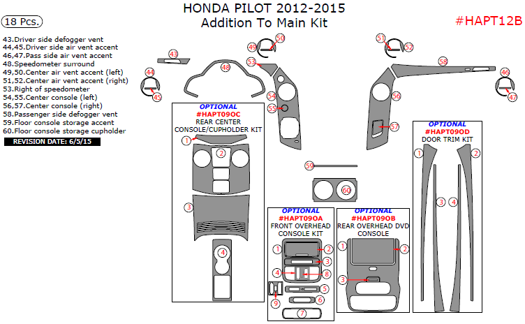 Honda Pilot 2012, 2013, 2014, 2015, Addition To Main Interior Kit, 18 Pcs.