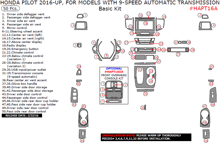 Honda Pilot 2016, 2017, 2018, For Models With 9-Speed Automatic Transmission, Basic Interior Kit, 50 Pcs.
