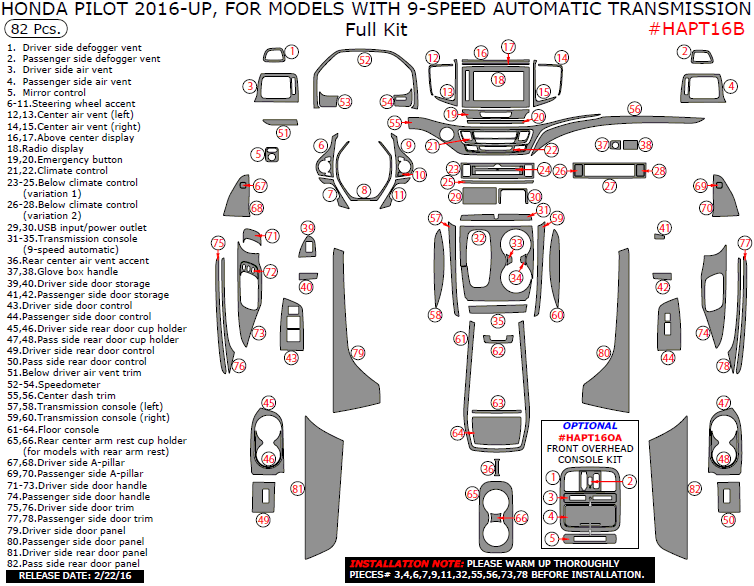 Honda Pilot 2016, 2017, 2018, For Models With 9-Speed Automatic Transmission, Full Interior Kit, 82 Pcs.