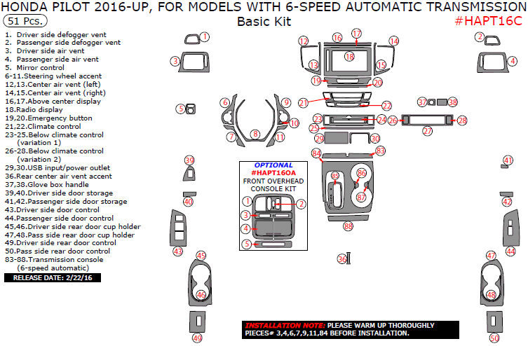 Honda Pilot 2016, 2017, 2018, For Models With 6-Speed Automatic Transmission, Basic Interior Kit, 51 Pcs.