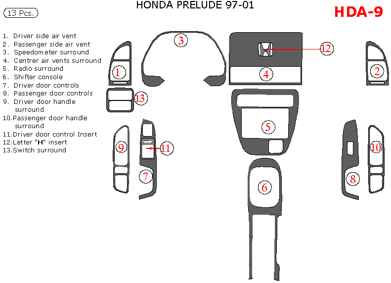 Honda Prelude 1997, 1998, 1999, 2000, 2001, Full Interior Kit, 13 Pcs.