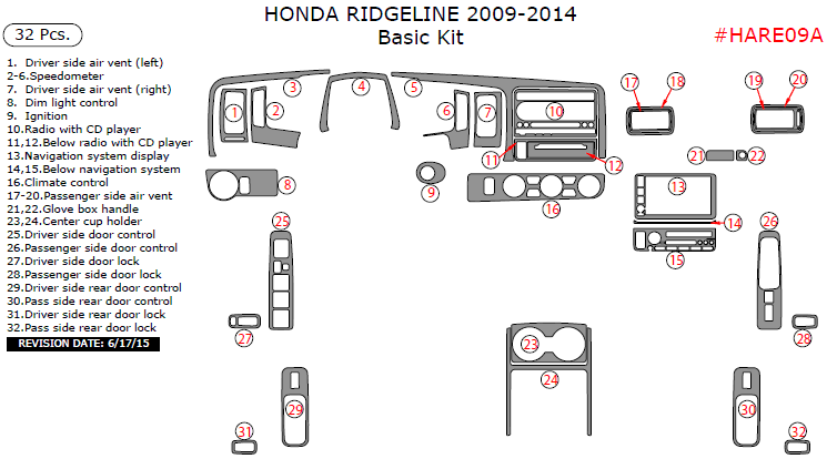 Honda Ridgeline 2009, 2010, 2011, 2012, 2013, 2014, Basic Interior Kit, 32 Pcs.