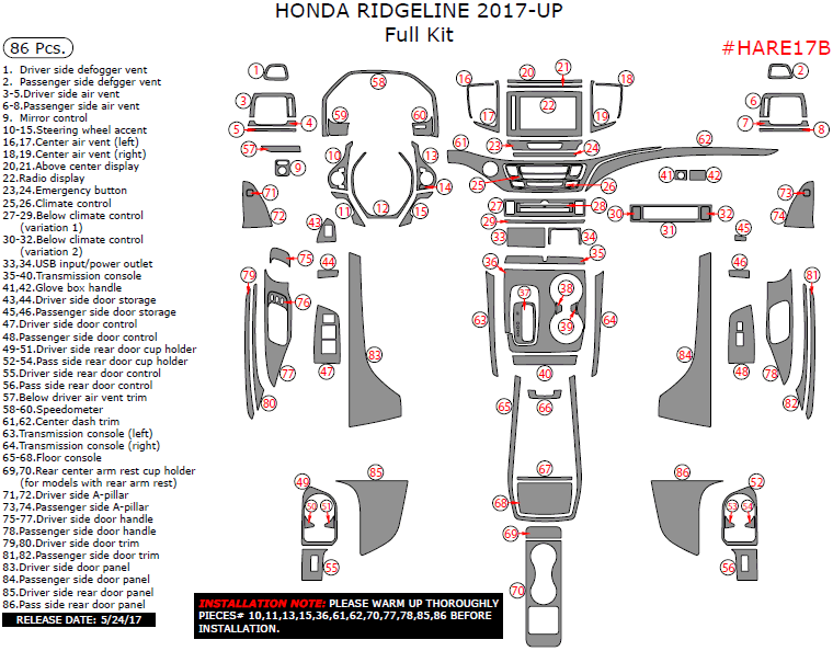 Honda Ridgeline 2017-2019, Full Interior Kit, 86 Pcs.