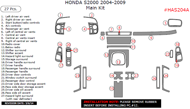 Honda S2000 2004, 2005, 2006, 2007, 2008, 2009, Main Interior Kit, 27 Pcs.