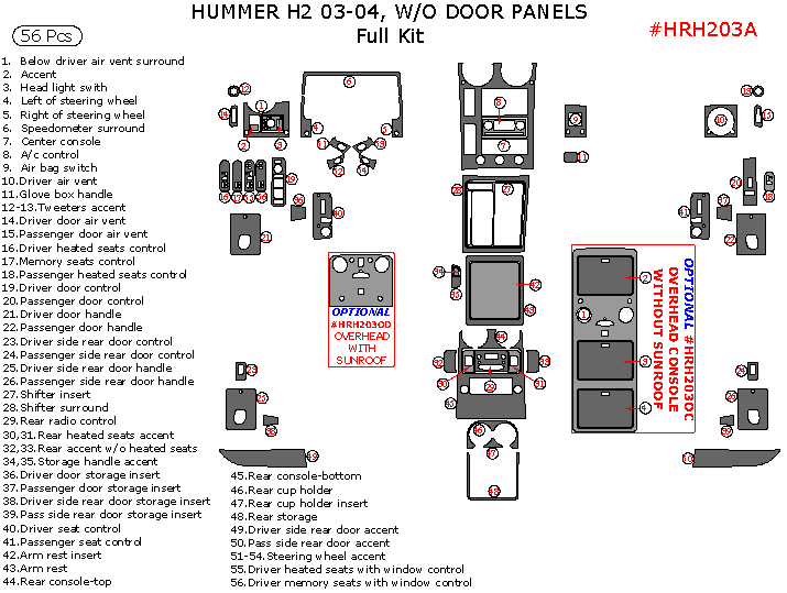 We offer a wide variety of colors and materials of Hummer H2 2003-2004, Full Interior Kit, W/o Door Panels, 56 Pcs. Choose your favourite option and place an order.